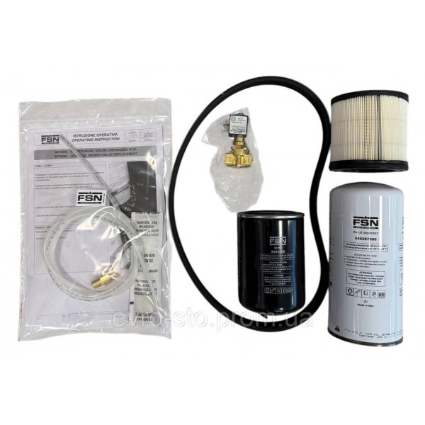 C260KTD04E Cервисный набор 4000ч. FINI PLUS 18-22 new Сервисный набор для компрессора включает в себя оригинальные фильтры FINI : воздушные - 1шт. масляный -1шт. фильтр-сепаратор -1шт. клапан дренажный -1 шт. ремень - 1шт. PL 991