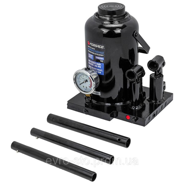 Бутылочный гидравлический домкрат на 32 тонны Forsage F-TH903501 . Мощное и надежное средство для поднятия и удержания автомобилей. Домкрат оснащен специальным предохранительным клапаном для защиты от перегрузки. Также домкрат оснащен специальным манометром, указывающим степень нагрузки на домкрат, и двумя поршнями, двухскоростной применятеся для быстрого подъема штока, односкоростной для точного регулирования положения штока под поднимаемым автомобилем. Этот домкрат обеспечивает безопасное поднятие, что делает его отличным выбором как для автомастерских, так и для личного использования. Грузоподьемность 32т, Высота подхвата 260мм, Ход штока 180мм, Максимальный уровень подъёма 420мм.