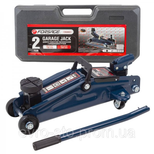 Вид домкрата подкатной с вращающейся ручкой (180 °). Механизм гидравлический. Грузоподъемность 2 тонны. Минимальная высота подъема 140 мм. Максимальная высота подъема 340 мм. В пластиковом кейсе.