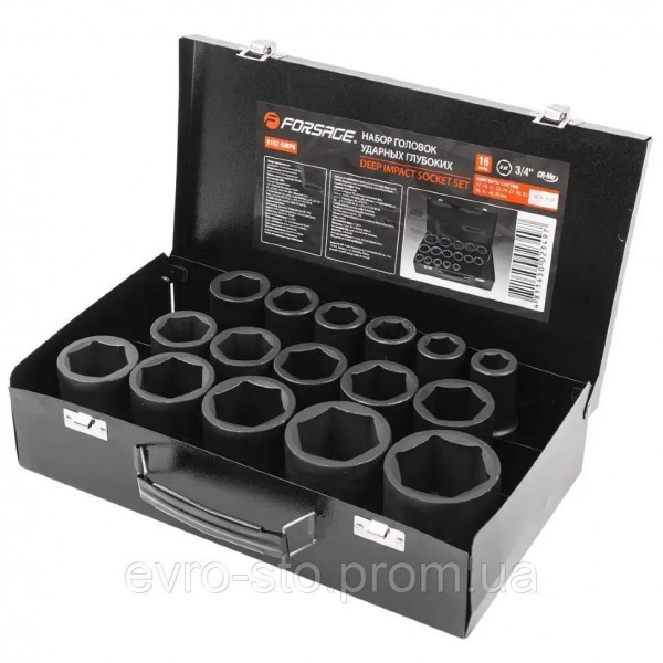 Набор ударных шестигранных торцевых головок Forsage F-6162-5MPB(6162MPB) включает в себя 16 насадок размером 17,19,21,22,24,27,30,32-36,38,41,46,50 мм с присоединительным квадратом 3/4 дюйма. Ударные головки устанавливаются на гайковерт и выдерживают высокие динамические нагрузки, поэтому подходят для проведения строительных работ и обслуживания автомобилей.НаборРазмеры:- 17,19,21,22,24,27,30,32-36,38,41,46,50 ммОсобенности - Глубокие- Посадочный квадрат: 3/4"- Ударность - головки изготовлены из хромомолибденовой стали, твердость рабочих частей составляет 44-48 HRC.- Матовое фосфатное покрытие предотвращает образование коррозии.- Набор поставляется в кейсе.