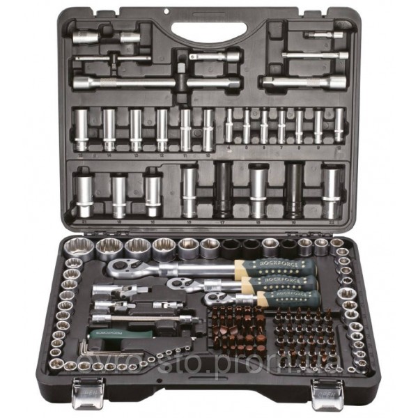Код товара: 28330, Состав: Набор инструмента 150+6пр.1/4" 3/8" 1/2"(6-гр.)(4-36мм; 3/8":10-19мм 12гр.; 1/2":27,30,32,36-12гр.)+(биты 5/16":М6,8,10,12,14; гибкий удлинитель 1/4") Набор инструментов ROCKFORCE RF-41501-5 PREMIUM в кейсе включает в себя 150+6 предметов с хвостовиками 1/4, 1/2 и 3/8 дюйма из сталей марок Cr-V и S2. Он применяется для монтажа и демонтажа резьбовых соединений при обслуживании и ремонте авто, а также при выполнении бытовых задач. Инструменты пригодятся автолюбителям и домашним мастерам. ПреимуществаТрещотки вращают крепеж мягко и плавно, что повышает удобство работы.Все детали набора имеют повышенную прочность и износостойкость, т.к. изготовлены из высококачественных марок стали хромованадиевой группы и S2 и термически обработаныМатовое антикоррозийное покрытие надежно защищает инструменты от разрушения.Обрезиненные трещотки удобно ложатся в руку благодаря эргономичным рукояткам и не разрушаются от воздействия бензина и масла.Механизм быстрого сброса позволяет легко менять насадки на трещотке.Набор поставляется в пластиковом ударопрочном кейсе с металлическими замками, поэтому его легко транспортировать и удобно хранить.Ложемент с подписанными типоразмерами позволяет надежно зафиксировать детали в отдельных ячейках и быстро найти необходимую насадку.Высокое качество инструментов гарантирует соответствие международным стандартам Состав набора:Посадочный квадрат: 1/4", 3/8", 1/2".Тип головок: 6-гранные, 12-гранные, Е-профиль, короткие, глубокие. Комплектация:головки 1/4"короткие 25 мм: 4, 4.5, 5, 5.5, 6, 7, 8, 9, 10, 11, 12, 13, 14 мм;головки 1/4"глубокие 50 мм: 4, 5, 6, 7, 8, 9, 10 мм;головки 1/4"Е-профиль 25 мм: Е4, Е5, Е6, Е7, Е8;головки-биты 1/4"HEX 35 мм: 3, 4, 5, 6 мм;головки-биты 1/4"TORX 35 мм: T8, Т9, Т10, Т15, Т20, Т25, Т27, Т30, Т8Н, Т9Н, Т10Н, Т15Н, Т20Н, Т25Н, Т27Н, Т30Н;головки-биты 1/4"SL 35 мм: 4, 5.5, 6.5, 7 мм;головки-биты 1/4"РН 35 мм: РН.0, РН.1, РН.2;головки-биты 1/4"PZ 35 мм: PZ.0, PZ.1, PZ.2;рукоятка 1/4"150 мм;трещотка 1/4"телескопическая;вороток 1/4"Т-образный усиленный 115 мм;удлинители 1/4": 50, 100 мм;кардан шарнирный 1/4";биты 5/16"HEX 30 мм: 7, 8, 10, 12, 14 мм;биты 5/16"TORX 30 мм: Т40, Т45, Т50, Т55, Т60, Т70, Т40Н, Т45Н, Т50Н, Т55Н, Т60Н, Т70Н;биты 5/16"SL 30 мм: 8, 10, 12 мм;биты 5/16"PH 30 мм: PH.3, PH.4;биты 5/16"PZ 30 мм: PZ.3, PZ.4;биты 5/16"SPLINE 30 мм: М6, М8, М10, М12, М14;головки 3/8"короткие 12-гранные 28 мм: 10, 11, 12, 13, 14, 15, 16, 17, 18, 19 мм;головки 3/8"глубокие 63 мм: 10, 11, 12, 13, 14, 15 мм;головки 3/8"Е-профиль 28 мм: Е10, Е11, Е12, Е14, Е16, Е18;головка 3/8"свечная 18 мм;трещотка 3/8" телескопическая;удлинитель 3/8"125 мм;кардан щарнирный 3/8";головки 1/2" короткие 38 мм: 10, 11, 12, 13, 14, 15, 16, 17, 19, 18, 19, 20, 21, 22, 24, 27, 30, 32, 36 мм (12-гранные: 27, 30, 32, 36 мм; усиленные: 17, 19, 21 мм);головки 1/2"глубокие 77 мм: 16, 17, 18, 19, 22 мм (усиленные 17, 19);головки 1/2"Е-профиль 38 мм: Е20, Е24;головки свечные 1/2"16, 21 мм;трещотка 1/2" телескопическая;удлинители 1/2"125, 250 мм;кардан шарнирный 1/2";переходник усиленный с 3/8"(F)*1/2"(M) с отверстием;битодержатель 3/8"(F)*5/16"(F) (HEX);битодержатель 1/2"(F)*5/16"(F) (HEX);ключи Г-образные шестигранные: 1.27, 1.5, 2, 2.5, 3, 4, 5 мм.Пластиковый кейс с металлическими защелками.
