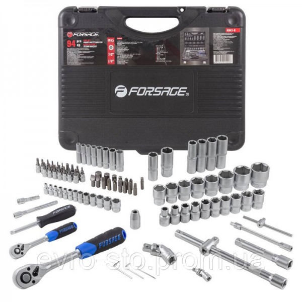Набор инструментов Forsage F-4941-5 в пластиковом кейсе включает в себя 94 предметов с присоединительным размером 1/2 и 1/4 дюйма из стали CrV. Он применяется для монтажа и демонтажа резьбовых соединений во время обслуживания и ремонта авто, а также выполнения бытовых работ. Инструменты пригодятся автолюбителям и домашним мастерам. ПреимуществаВысокая прочность и износостойкость — все элементы набора изготовлены из высококачественной стали хромованадиевой группы и термически обработаны.Защита от разрушения — матовое антикоррозийное покрытие предотвращает появление ржавчины, а рукоятки трещоток из полипропилена и резины устойчивы к воздействию бензина и масла.Простое переключение между задачами — механизм быстрого сброса позволяет легко менять насадки на трещотках.Быстрый поиск нужного инструмента — элементы набора надежно зафиксированы в ячейках ложемента с подписанными типоразмерами.Комфортная работа — трещотки вращают крепеж мягко и плавно, а их эргономичные рукоятки удобно лежат в руке.Удобное хранение и транспортировка — набор поставляется в пластиковом ударопрочном кейсе с металлическими замками.Высокое качество — характеристики изделий соответствуют международным стандартам, гарантия на торцевые головки с квадратом 1/2 дюйма размером от 8 мм действует пожизненно. Комплектация: головки 1/4"короткие 25 мм: 4, 4.5, 5, 5.5, 6, 7, 8, 9, 10, 11, 12, 13, 14 мм; головки 1/4"глубокие 50 мм: 6, 7, 8, 9, 10, 11, 12, 13 мм; головки-биты 1/4"HEX 35 мм: 3, 4, 5, 6 мм; головки-биты 1/4"TORX 35 мм: T8, T10, T15, T20, T25, T30; головки-биты 1/4"SL 35 мм: 4, 5.5, 6,5; головки-биты 1/4"РН 35 мм: РН.1, РН.2; головки-биты 1/4"PZ 35 мм: PZ.1, PZ.2; трещотка 1/4"; рукоятка 1/4"150 мм; вороток Т-образный 1/4"115 мм; удлинители 1/4": 50, 100 мм; гибкий удлинитель 1/4"145 мм; кардан шарнирный 1/4"; биты 5/16"HEX 30 мм: 8, 10, 12, 14 мм; биты 5/16"TORX 30 мм: Т40, Т45, Т50, Т55; биты 5/16"SL 30 мм: 8, 10, 12; биты 5/16"PH 30 мм: PH.3, PH.4; биты 5/16"PZ 30 мм: PZ.3, PZ.4; головки 1/2"короткие 38 мм: 10, 11, 12, 13, 14, 15, 16, 17, 18, 19, 20, 21, 24, 27, 30, 32 мм; головки 1/2"глубокие 77 мм: 14, 15, 17, 19 мм ; головки свечные 1/2": 16, 21 мм; трещотка 1/2"; удлинители 1/2": 125, 250 мм; кардан шарнирный 1/2"; адаптер с отверстием с 3/8"(F)*1/2"(M) ; битодержатель 1/2"(F)*5/16"(F); адаптер-переходник под шуруповерт 1/4"(F)*1/4"(F) 30 мм; ключи Г-образные 6-гранные короткие: 1.5, 2, 2.5 мм. Пластиковый кейс с металлическими защелками.