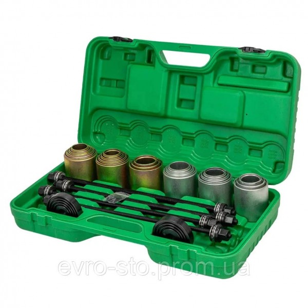Набор для замены сайлентблоков, втулок и подшипников Rockforce RF-933T1— универсальный комплект из 26 предметов, предназначенный для профессионального демонтажа и монтажа без необходимости снятия узлов с автомобиля. Оптимально подходит для работы в автосервисах и на СТО. Преимущества и особенности: Широкая совместимость. Позволяет обслуживать различные типы сайлентблоков, втулок и подшипников разных размеров, включая цилиндрические и конусные элементы. Работа без демонтажа узла. Конструкция набора дает возможность выполнять замену непосредственно на автомобиле, что экономит время и снижает трудозатраты. Минимизация риска повреждений. Точная геометрия гильз и опорных элементов уменьшает вероятность повреждения посадочных мест и деталей подвески. Прочный материал. Инструменты изготовлены из углеродистой стали, устойчивой к нагрузкам и износу при интенсивной эксплуатации. Рабочие параметры. Подходит для резьбовых соединений М10, М12, М14 и М16. Комплектация: - Гильзы — 20 шт., внутренний диаметр 34–72 мм с шагом 2 мм. - Опорные диски — 2 шт. - Болты силовые — М10, М12, М14, М16. - Прочный пластиковый кейс для удобного хранения и транспортировки. Набор обеспечивает точную и безопасную установку элементов подвески и является надежным решением для профессионального использования.