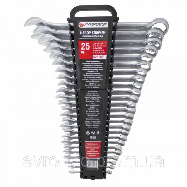 Представляем набор комбинированных ключей Forsage F-5261MP — комплексный комплект из 25 ключей, изготовленных из высококачественной CrV-стали и покрытых «матовым хромом». Этот набор, охватывающий размеры от 6 до 32 мм, станет незаменимым помощником для быстрого монтажа и демонтажа крепежных элементов во время ремонтных работ дома или в гараже. Кольцевой зев с углом наклона 15 градусов относительно плоскости инструмента обеспечивает удобство работы в различных условиях. Преимущества: Высокая прочность и сопротивление деформации: Ключи из хромованадиевой стали (CrV) обладают необходимыми прочностными характеристиками и высокой сопротивляемостью деформации. Долговечность рабочих частей: Рабочие части инструментов прошли закалку до твердости 48 HRC, что значительно продлевает их срок службы. Защита от коррозии: Матовое хромоникелевое покрытие защищает ключи от образования коррозии. Надежный захват крепежа: Накидные части с 12-гранным профилем позволяют охватить крепеж по всей поверхности, за счет чего снижается риск деформации его граней. Удобное хранение и транспортировка: Ключи удобно хранить, и они не потеряются во время транспортировки, так как поставляются в пластиковом держателе. Полная комплектация: Набор позволяет решить большинство задач по монтажу, так как состоит из 25 ключей основных типоразмеров. Оптимальный угол наклона: Кольцевой зев обеспечивает удобство работы благодаря углу наклона 15 градусов относительно плоскости инструмента. Комплектация (размеры, мм): 6, 7, 8, 9, 10 (2 шт.), 11, 12 (2 шт.), 13 (2 шт.), 14 (2 шт.), 15, 16, 17 (2 шт.), 18, 19, 21, 22, 24, 27, 30, 32.