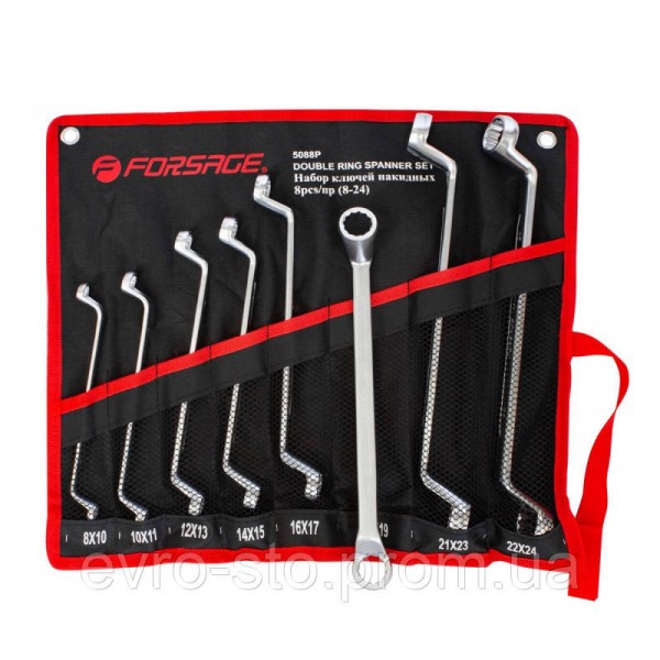 Набор гаечных ключей накидных отогнутых Forsage F-5088P. НаборКлючи:- 8х10 мм- 10х11 мм- 12х13 мм- 14х15 мм- 16х17 мм- 18х19 мм- 21х23 мм- 22х24 мм- Полотно держательОсобенности- Конструкция: Накидные, отогнутые- Угол: 75 гр. - Двухсторонний- Полотно держатель для удобства