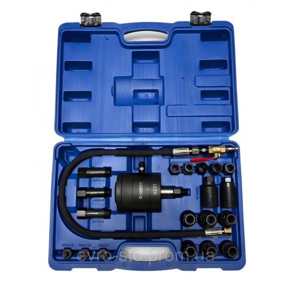 Пневматический съемник форсунок дизельных форсунок Forsage F-6221 Пневматический съемник форсунок предназначен для эффективного и безопасного демонтажа форсунок дизельных систем. Он идеально подходит для случаев, когда стандартные методы — поворот, вытягивание щипцами или ключами — не дают результата. Принцип работы: инструмент использует силу сжатого воздуха, что позволяет быстро и без усилий удалять проблемные форсунки, минимизируя риск повреждения деталей двигателя. Основные характеристики: Материал: прочная сталь для долговечности и надежности. Момент вращения: 20–30 Нм. Универсальность: подходит для 99% форсунок на рынке (Bosch, Delphi, Denso, Siemens). Совместимость с резьбовыми соединениями. Комплектация (адаптеры): M8x1,0, M8x1,25, M8x1,5, M14x1,5, M16x1,5, M17x1,0, M18x0,75, M18x1,5, M20x1,0, M20x1,5, M22x1,5, M25x0,5, M25x1,0, M26x0,75, M27x0,75, M27x1,0, M29x1,0, M31x0,75. Технические характеристики: Рабочее давление: 6–12 бар. Подключение: совместим со стандартными компрессорами. Воздушный шланг: W.P32MPa. Преимущества использования: • Быстрое и легкое удаление форсунок даже в сложных условиях. • Прочная конструкция, рассчитанная на интенсивную работу. • Широкий выбор адаптеров обеспечивает универсальность. • Удобство и скорость работы благодаря использованию сжатого воздуха. Этот инструмент — незаменимый помощник для мастеров автосервисов, СТО и владельцев дизельных автомобилей.