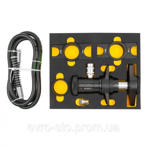 Съемник рулевых наконечников, шаровых и шлицевых соединений Forsage F-V5916 — профессиональный инструмент для работы с рулевыми наконечниками, шаровыми и шлицевыми соединениями. Изготовлен из высокопрочных материалов, обеспечивающих долговечность и надежность даже при интенсивной эксплуатации. Инструмент позволяет безопасно и быстро снимать соединения без повреждения деталей, а эргономичная ручка обеспечивает удобный захват и комфорт при работе. Компактные размеры делают его удобным для хранения в мастерской или автомобиле, а простая установка и использование делают его доступным для любого пользователя. Характеристики: - Диаметры шаровых: 19, 26, 28, 30, 31, 36 мм - Высота проставочных колец: 13 и 25 мм - Максимальная ширина захвата: 74 мм - Макс. рабочее давление: 700 бар (10000 psi) - Максимальное усилие: 4,5 т Комплектация: - Съемник - Ответная вилка — 3 шт. - Нажимная вилка - Проставочное кольцо — 2 шт. - БРС-муфта/штуцер - Гидрошланг Forsage F-V5916 — надежное и универсальное решение для профессионалов, обеспечивающее точную и безопасную работу с подвеской и рулевыми механизмами автомобилей.