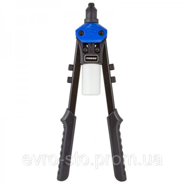 Двуручный заклёпочник Forsage F-67806 длиной 310 мм предназначен для работы с алюминиевыми и стальными заклёпками диаметром 2,4-6,4 мм и 2,4-4,8 мм соответственно. Предназначен для прочного соединения листовых металлических заготовок, легких конструкций небольшой толщины и металлопрофилей. Двуручный заклёпочник требует меньше усилий от оператора для вытягивания шпильки, поэтому подходит для профессионального применения и больших объемов работ. Преимущества Заклёпочник отличается высоким ресурсом и коррозионной стойкостью, т.к. отлит из прочного алюминиевого сплава ADC12 под высоким давлением.Трехсегментный цанговый механизм надежно фиксирует шпильку и не допускает ее перекашивания во время работы.Повышенную стойкость цангового механизма к нагрузкам обеспечивает хромомолибденовая сталь, которая используется при его изготовлении.Эргономичные рукоятки с резиновыми накладками обеспечивают удобство работы.Специальный контейнер для отработанных вытяжных шпилек позволяет содержать в чистоте рабочее место.К заклёпочнику прилагаются насадки для работы с заклёпками диаметром 2,4-3,2-,4,0-4,8-6,4 мм.